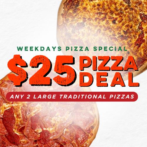 Weekdays Pizza Special$25PICK UP ONLY Any 2 Large Traditional Pizzas for only $25. Available Monday - Wednesday.