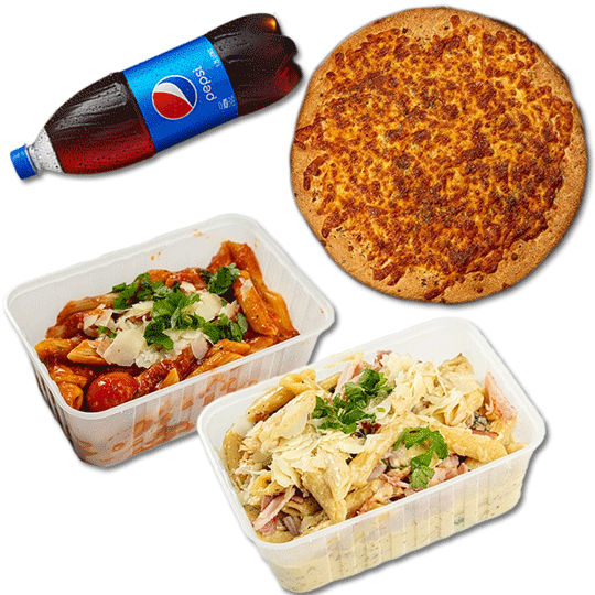 Mix n Match$47.901 Large Pizza + 1 Small Garlic Pizza, 1 Fresh Pasta + 1.25lt Drink