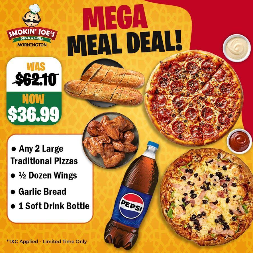 MEGA DEAL$36.99Any 2 Traditional large pizza, half dozen chicken wings and Garlic bread and 1.25L Bottle of drinkOut of stock