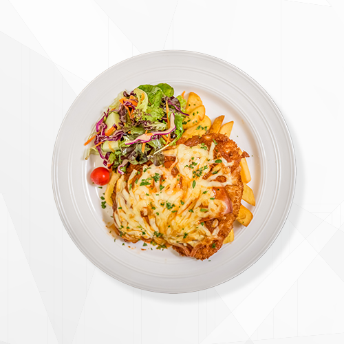 Joes Signature Parma$31.90w/ your choice of; traditional , ham napoli sauce + cheese , bolognese sauce + cheese , aussie (bacon, onion + cheese) peri peri (onion, roast peppers + spicy sauce) , mushroom (creamy mushrooms + cheese) , aloha (ham + pineapple), served with Garden salad and chips